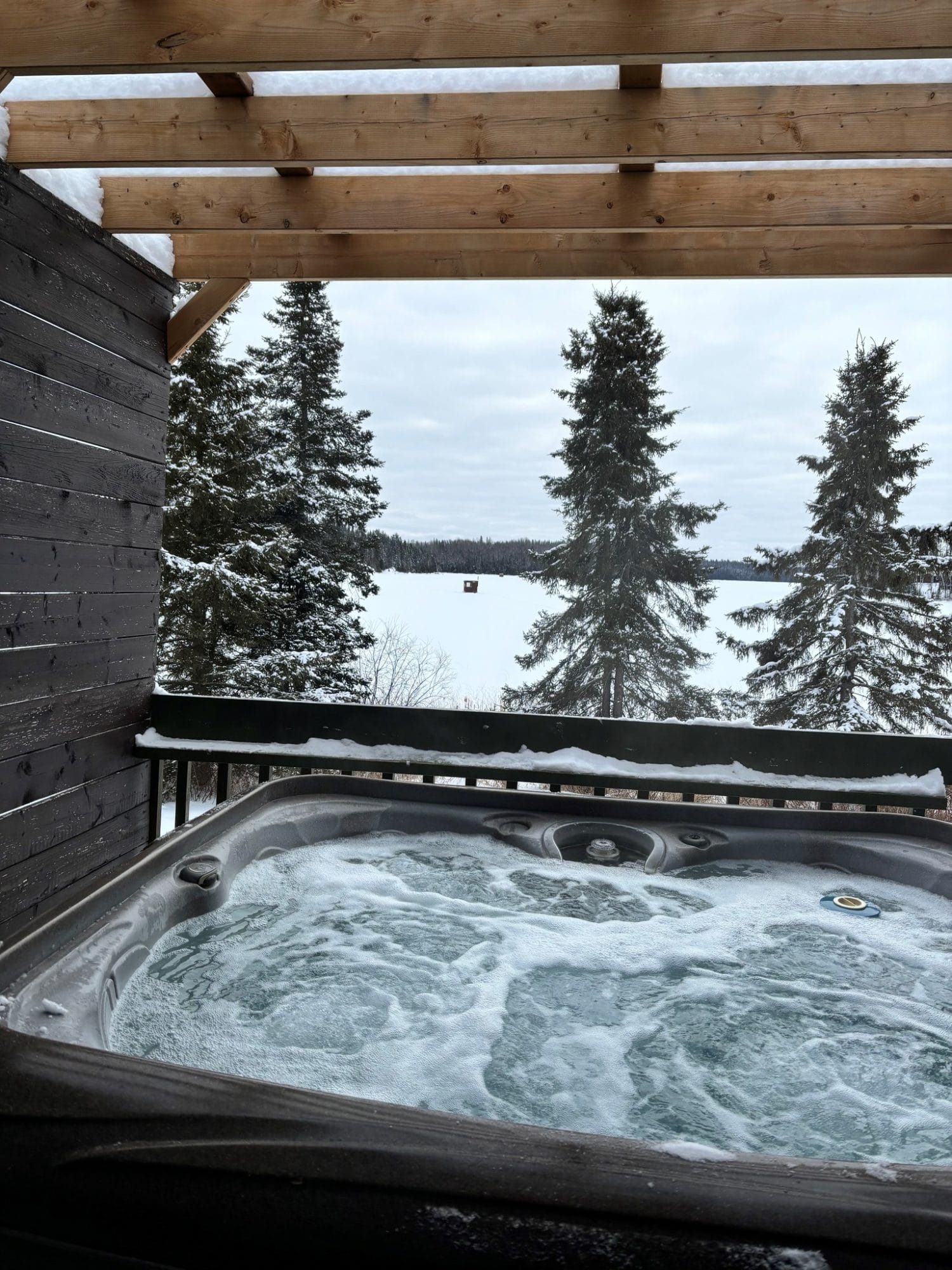 Le Domaine Baie des Pins coche parfaitement ce qu’on recherche en hiver quand on veut vraiment décrocher : un chalet confortable, une vue qui apaise dès qu’on s’assoit, et ce petit plaisir incomparable de glisser dans un spa privé pendant que la nuit s’installe. Bordé par un décor mature, le séjour se vit à votre rythme : une marche en sentier pédestre quand l’air est clair, un moment dehors pour profiter du calme, puis retour au chaud. Et si vous aimez les activités hivernales, l’endroit propose aussi de quoi agrémenter les journées : pêche blanche (avec possibilité de louer une cabane à pêche), glissade et patinoire lorsque la température le permet. L’endroit parfait pour savourer l’hiver par petites doses : un moment dehors, puis l’ambiance douce à l’intérieur — sans se presser, juste pour se sentir bien.