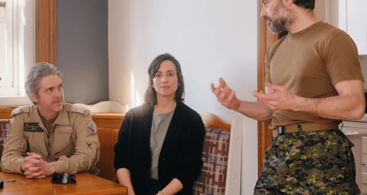 Pour ce projet, Roxanne Bouchard s’est immergée dans l’univers de l’armée canadienne, rencontrant une trentaine de militaires de huit corps de métier, écoutant leurs histoires, visitant les bases militaires, confrontant ses propres valeurs et préjugés. Comment vivre avec les souvenirs et traumas de la guerre? C’est l’une des questions centrales que pose ce texte, qui offre aussi une réflexion sur les rencontres marquantes pouvant survenir quand on ose s’ouvrir aux autres. Avant d’avoir été adaptée pour la scène, cette pièce est d’abord un projet de recherche de Roxanne Bouchard, qui a donné naissance au livre 5 balles dans la tête; récits de guerre, publié chez Québec Amérique.