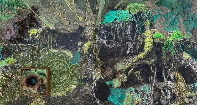 Il y a la nature à protéger, puis celle qui nous protège. Longtemps plongée dans un art à la défense de l’environnement, Véronique Doucet opère un changement de posture pour plonger dans un nouveau cycle de création, passant de l’écoféminisme à l’écoféminin, de l’action à la contemplation, du sens unique à la réciprocité. Désireuse de s’imprégner des énergies de la forêt pour tisser le visible et l’invisible, l’artiste met son hypersensibilité au service de l’écoute, de l’observation et de l’accueil de ce que le territoire a à lui proposer. Dans un processus lent et intérieur, elle laisse son vécu se transposer dans la forme des paysages, capture les images et récolte ce qui fait sens pour laisser émerger à sa conscience ce qui lui était inaccessible et le transposer dans la matière. Intervenant en techniques mixtes sur ses photographies, elle cumule en parallèle les écofacts et artéfacts qui la ramènent à sa lignée pour réfléchir aux héritages qui nous façonnent. Est-il possible, voire nécessaire, de s’offrir parfois la possibilité du déracinement, de la rupture avec la charge émotionnelle et relationnelle qui transcende les générations et pèse sur nos épaules? […]