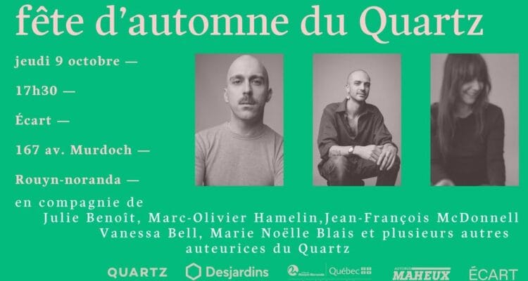 Seront de la fête l’énigmatique Julie Benoît, l’artiste aux cents pas Marc-Olivier Hamelin, le troubadour au rire contagieux Jean-François McDonnell, l’éditrice-poète-nageuse Vanessa Bell et la directrice-tout sourire Marie Noëlle Blais. Se joindront à eux bon nombre d’auteurs et autrices de la maison car il fera bon être à l’Écart ce jeudi 9 octobre.