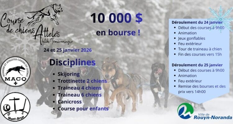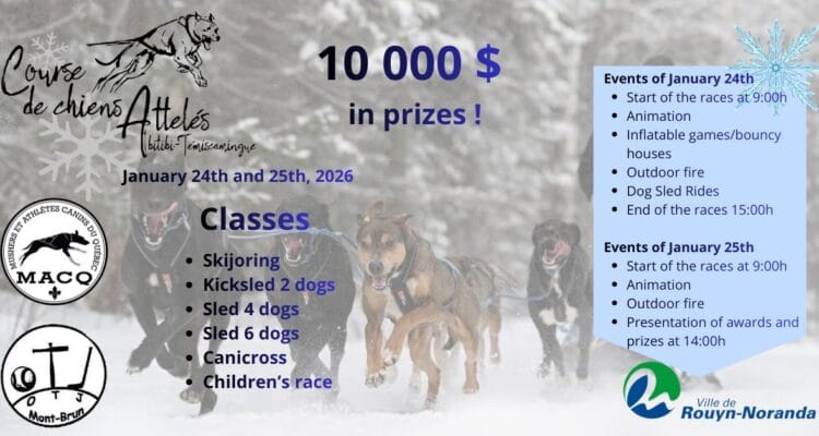 Venez assister à la spectaculaire course de chiens attelés dans le quartier Mont-Brun, dans la ville de Rouyn-Noranda en Abitibi-Témiscamingue. Plusieurs activités sont proposées, en collaboration avec le